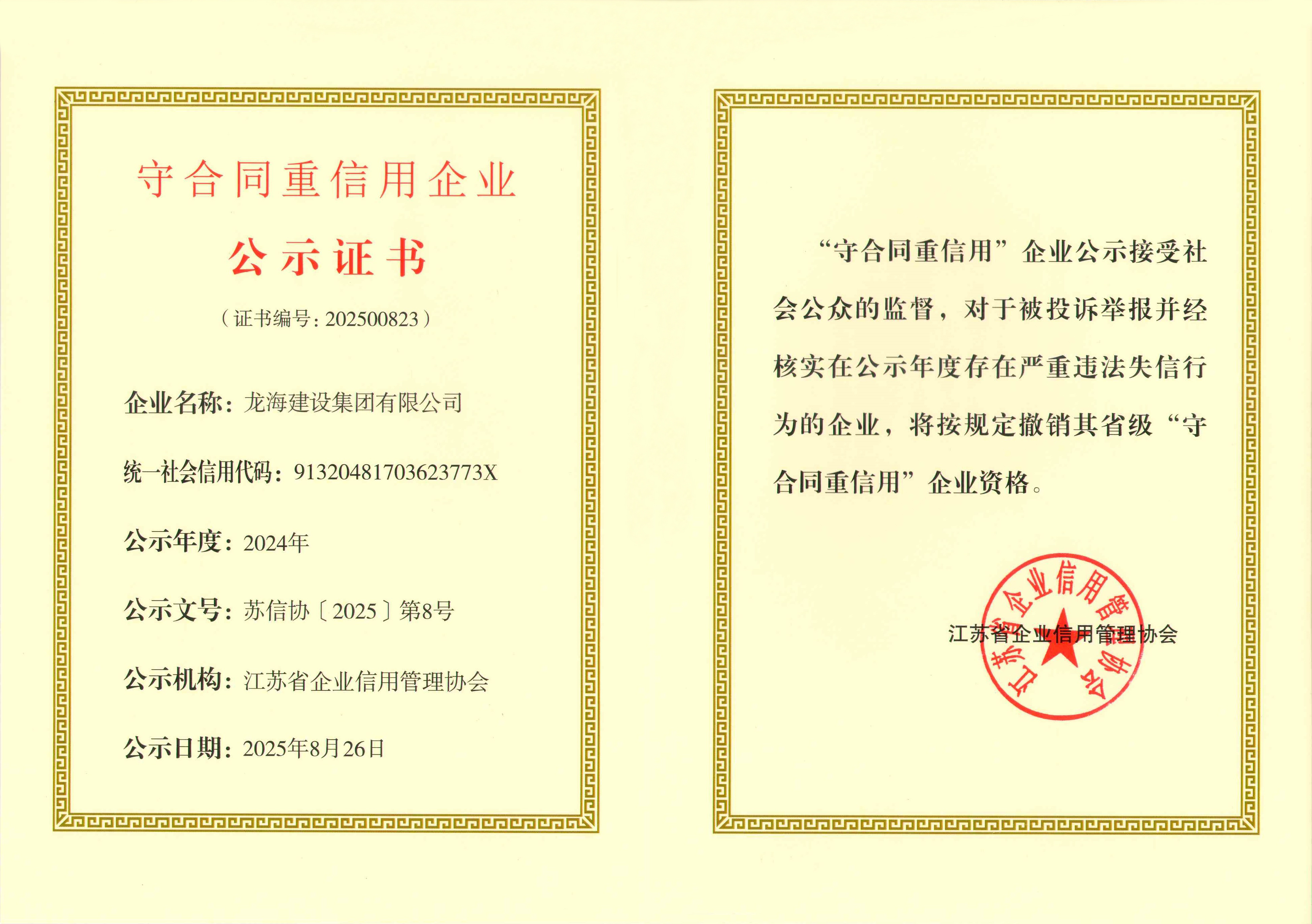 近日,從江蘇省企業(yè)信用管理協(xié)會(huì)傳來(lái)喜訊,龍海建設(shè)集團(tuán)有限公司憑借在合同管理和信用建設(shè)方面的卓越表現(xiàn),成功獲得 “2024年度江蘇省守合同重信用企業(yè)”榮譽(yù)稱(chēng)號(hào)。這一榮譽(yù)不僅是對(duì)龍海建設(shè)集團(tuán)過(guò)往努力的高度認(rèn)可,更是其在建筑行業(yè)持續(xù)穩(wěn)健發(fā)展的有力見(jiàn)證。